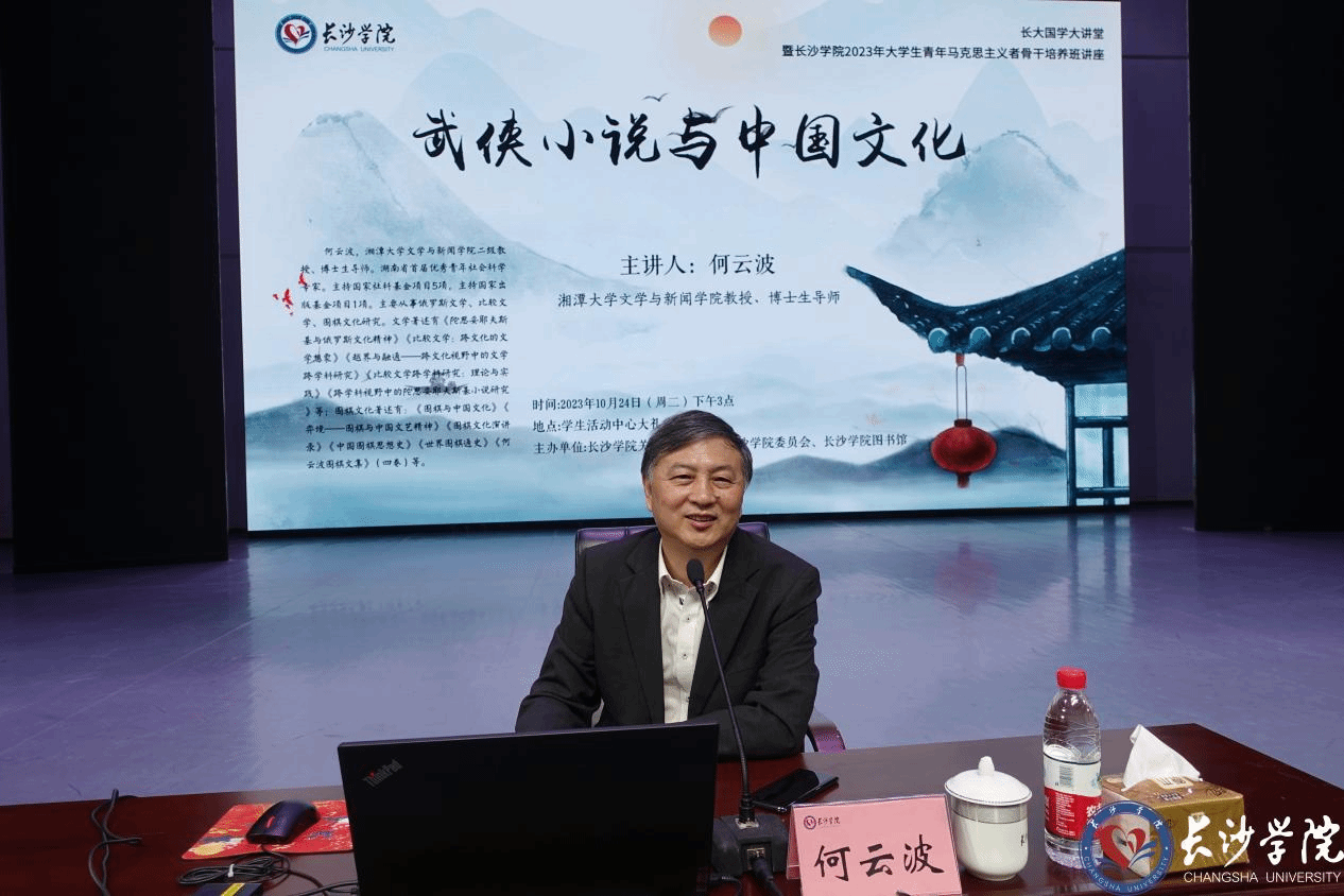 10月24日下午,由爱体育在线注册关工委、校团委、图书馆联合举办的长大国学大讲堂暨2023年大学生青年马克思主义骨干培训班主题讲座在学生活动中心大礼堂开讲。湘潭大学文学与新闻学院二级教授、博士生导师何云波为全校600余名师生带来了题为《武侠小说与中国文化》的精彩讲座。纪委书记丁文出席讲座。